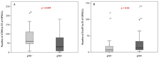 Evaluation of CD68 macrophage number in the ST compartment (A) and FoxP3 number in the IT area (B) of oropharyngeal tumors according to p16 status (Mann-–Whitney U test, p = 0.005 and p = 0.02, respectively) (*) asterisk symbols correspond to extreme atypical values.
