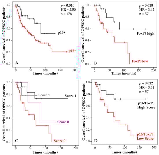 Kaplan-Meier curves of the OS of OPSCC patients according to p16 status (A), the number of FoxP3+ cells infiltrating the tumor (B), the combination of both parameters resulting in four groups (C), and the score combining p16 status and FoxP3 density (D).