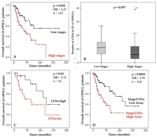 Kaplan–Meier curves of the OS of OPSCC patients according to staging (A), the number of CD1a+ cells infiltrating the ST (C), and the score combining the staging and CD1a density (D). Mann–Whitney test illustrating the number of CD1a cells in the ST of OPSCC patients according to the staging (low (I/II) versus high (III/IV) stages, as described in the TNM staging system 8) (B).
