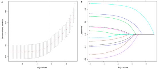 Selection of prognostic factors using least absolute shrinkage and selection operator (LASSO) Cox regression. (A) Tuning parameter λ based on minimum criteria in the LASSO regression. The partial likelihood binomial deviance is plotted against log λ. Using the minimum criteria and the one standard error of the minimum criteria, dotted vertical lines are set at the optimal values log λ, where factors are selected. (B) For clinicopathological features, LASSO coefficient profiles are plotted vs. log λ sequences. The dotted vertical line shows the nonzero coefficients, where eight nonzero coefficients are included.
