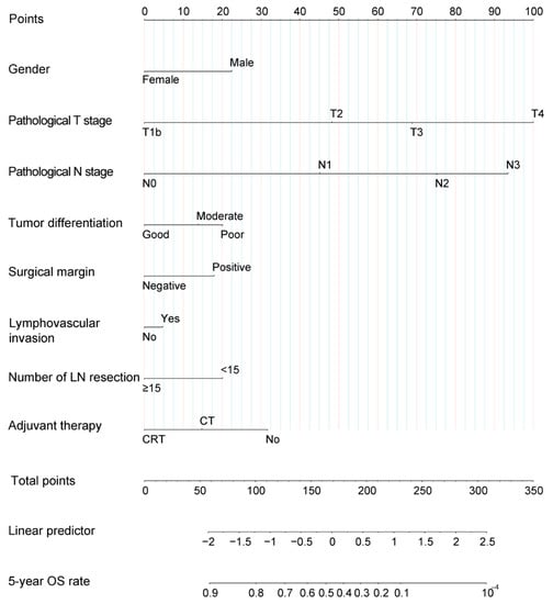 Consistent with previous findings [10,15,16,17], the most significant prognostic factor in the nomogram was pathological T stage, followed by pathological N stage and adjuvant chemoradiotherapy, indicating the important role of adjuvant chemoradiotherapy in survival improvement. For example, when other clinicopathological factors were the same, nomogram scores of patients with pT3N0M0 plus adjuvant chemoradiotherapy were even lower than those with pT2N0M0 plus observation, demonstrating that locally advanced disease with effective postoperative chemoradiotherapy has greater potential to show a non-inferior survival than early disease. For patients with LA-ESCC, adjuvant radiotherapy could significantly increase local control rate and decrease local recurrences, which were ultimately converted to prolonged OS [4,25]. In the prospective RCT [4], compared with surgery alone, the addition of postoperative concurrent chemoradiotherapy and radiotherapy in LA-ESCCs significantly improved 18.5% and 12.8% in the 3-year OS rate, respectively. An improvement of 12.8% and 5.7% in the 3-year OS was attributed to radiotherapy and chemotherapy, respectively, which indicated adjuvant radiotherapy has a more important role than chemotherapy. This real-world retrospective study further confirmed that the addition of adjuvant radiotherapy to chemotherapy brought an increase of 10–20% in 5-year OS rate in most cases. In contrast, adjuvant chemotherapy alone could only bring up to 10% improvement in the 5-year OS rate in a small proportion of patients. Furthermore, only concurrent chemoradiotherapy and not chemotherapy alone could significantly improve long-term survival for patients with low to intermediate prognostic risk (nomogram score 110 to 159) (Figure 5A,B).