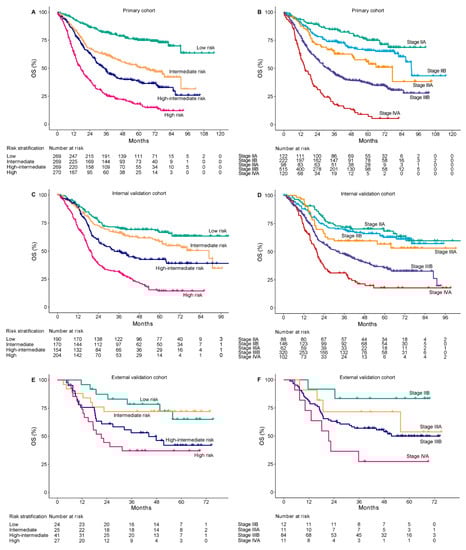 Validation cohorts were also stratified into four risk groups according to the same criteria. In the internal validation cohort, when compared with the low-risk group, a significantly worse survival was also observed in intermediate-risk (HR, 1.37; 95% CI, 1.01–1.93; p = 0.047), high-intermediate-risk (HR, 2.09; 95% CI, 1.5–2.91; p < 0.001), and high-risk (HR, 4.07; 95% CI, 3.01–5.49; p < 0.001) groups, with 5-year OS rate of 66.7%, 58.4%, 42.5%, and 14.4%, respectively (Figure 4C). Due to a limited number of patients in the external validation cohort, only the high-risk group showed a significantly worse prognosis than the low-risk group (HR, 3.24; 95% CI, 1.34–7.85; p < 0.01) (Figure 4E). The internal and external validations showed acceptable consistency with the primary cohort in nomogram-based risk stratifications.