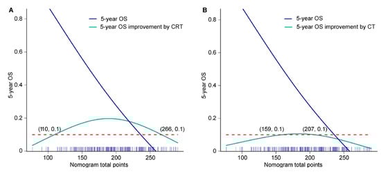 The 5-year OS improvement corresponding to the nomogram total point after (A) adjuvant chemoradiotherapy and (B) adjuvant chemotherapy. Blue solid line, 5-year OS rate corresponding to nomogram total point; green solid line, 5-year OS rate improvement (β—α) attributing to adjuvant therapy corresponding to nomogram total point; red dotted line, 5-year OS equal to 10%; blue stick on the X axis, the distribution frequency of nomogram total point. CRT, chemoradiotherapy; CT, chemotherapy; OS, overall survival.