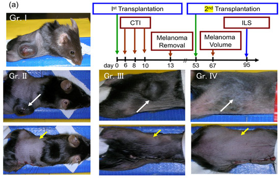 (a) Experimental operation processes with mice showing the growth inhibition of re-challenged melanoma (second transplantation) after removal of NPrCAP/M-treated melanoma (first transplantation) through immune processes. Control, non-treated; Gr. I, magnetite alone (no NPrCAP, no heat); Gr. II: Magnetite alone without NPrCAP, but with 43 °C heat for 30 min by AMF exposure; Gr. III: NPrCAP/M treatment, but no AMF exposure; Gr. IV: mouse with both NPrCAP/M and AMF exposure. After removal of the first transplant, all mice received the second re-challenge melanoma transplantation. White arrows, the site transplanted with melanoma at first transplantation; yellow arrows, the site transplanted with rechallenged melanoma at second transplantation. Tumor volume was measured at day 67 and representative photos are shown. ILS: Increased lifespan. CTI: Chemo-thermo-immuno-therapy. Adapted from [45]. (b) Treatment protocols for the 4 groups of mice described in (a) and an untreated control group. After primary B16F1 melanoma transplantations on day 0, treatments with magnetite nanoparticles with/without NPrCAP and with/without AMF exposure were administered on days 6, 8, and 10, tumors were removed on day 13, and second, re-challenge B16F1 melanomas were transplanted on day 53. (c) Daily increases in primary tumor volumes (mm3) after transplantation in control, Gr III, and Gr IV mice. (d) Tumor volumes (mm3) of re-challenge melanomas two weeks after transplantation on day 53, after primary B16F1 transplantations, treatments, and removal of primary tumors, as described in (b). (e) Kaplan–Meier survival curves of experimental mice up to 90 days after tumor re-challenge. Adapted from [45].