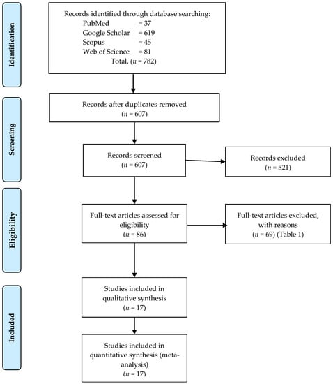 In total, 782 abstracts and titles were obtained through electronic database searches, and 175 articles were excluded due to duplicate articles (Figure 1). Then, the remaining 697 articles proceeded with screening by reading the titles and abstracts. Subsequently, 521 articles were excluded as they did not fulfil the criteria. Lastly, the relevance of 86 full-text articles was screened in detail. A total of 69 articles were excluded in the final step as did not meet the study aims, and reasons for excluded full-text articles were listed (Table 1). The remaining 17 studies were all evaluated for risk of bias according to AHRQ (Table 2). Elements which did not apply to the study design (-) were excluded from the domain summary. Only the minimum 50% of the elements in each domain were accounted for as an A score. Six studies were evaluated with an A score for nine domains [6,9,18,19,20,21], six studies with an A score for eight out of nine domains [22,23,24,25,26,27], three studies with an A score for seven out of nine domains [5,11,28], and two studies with an A score for six out of nine domains [29,30].