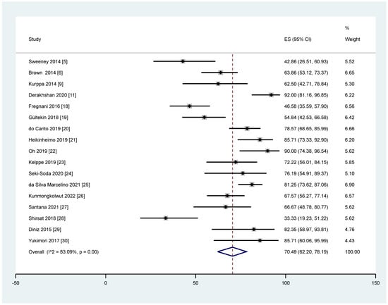 Heterogeneity was significant for the pooled prevalence of BRAF mutation among ameloblastoma, which had a p < 0.05 in Cochrane Q statistics, and I2 statistics values of 83.09%. From 17 studies that reported total BRAF mutation cases, the overall pooled prevalence among ameloblastoma based on QEM was 70.49% (95% CI = 62.20–78.19%; p < 0.05) (Figure 2). Publication bias of this pooled prevalence was also evaluated using a funnel plot, showing a symmetrical plot, indicating a low potential risk of publication bias (Figure 3).