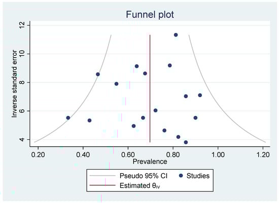 A funnel plot of included studies was extracted from Stata software (version 17) and used to evaluate the risk of publication bias. Plotted graph with symmetrical distribution of inverted funnel shape and without outliers indicates a low risk of bias.