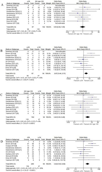 Forest plot of age groups with BRAF V600E mutation in ameloblastoma cases. (A) Young age group versus adult age group; (B) young age group versus older age group; (C) adult age group versus older age group; (D) young and adult age group versus older age group.