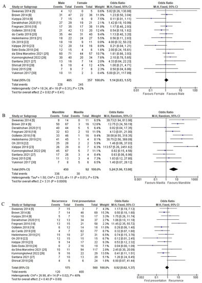 Forest plot of clinicopathological features association with BRAF V600E mutation in ameloblastoma cases. (A) Sex with BRAF V600E mutation; (B) tumour location with BRAF V600E mutation; (C) recurrence with BRAF V600E mutation.