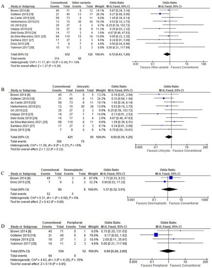 Forest plot of histological variants association with BRAF V600E mutation in ameloblastoma cases. (A) Conventional versus other variants; (B) conventional versus unicystic; (C) conventional versus desmoplastic; (D) conventional versus peripheral.