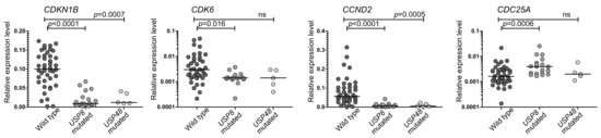Previous reports on expression profiling in USP8-mutated and wild-type tumors showed difference in the expression of the large number of genes and, importantly, the most differentially expressed genes included those involved in the regulation of the cell cycle including CDKN1B, CCND2, CDK6 and CDC25A [2,3].