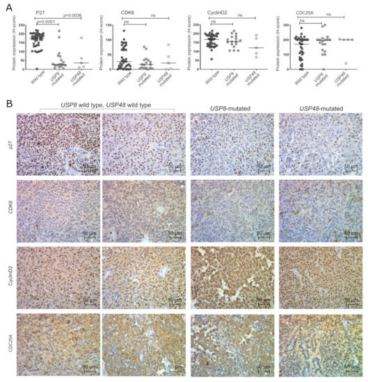 We observed a significantly lower level of p27 in both USP8-mutated and USP48-mutated tumors as compared to wild-type patients (p < 0.0001 and p = 0.0036, respectively). A significant correlation between protein expression and gene expression was found in the entire set of tumor samples (Spearman correlation R = 0.536, p = 0.0078). The differences in the expression of other cell cycle genes were not observed at protein level. A slight but nonsignificant decrease in CDK6 expression was observed in USP8-mutated tumors. No significant difference was also observed in the expression of Cyclin D2 (encoded by CCND2) or CDC25A at protein levels. A correlation between the CDKN1B expression levels and P27 immunoreactivity score was observed (Spearman R = 0.536; p = 0.0003) while no significant correlation between gene and protein expression was found for CDK6, CCND2 and CDC25A.