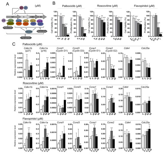 The effect of inhibitors of cyclin-dependent kinases (CDKs), palbociclib, roscovitine and flavopiridol, on AtT-20/D16v-F2 corticotroph cells. (A). Simplified scheme of cell cycle regulation indicating the specificity of each CDK inhibitor; (B). The effect of cell cycle inhibitors on viability and proliferation of AtT-20/D16v-F2 cells. Difference in viability and proliferation of treated cells was evaluated in comparison to untreated cells. ** indicates p < 0.001, *** indicates p < 0.0001; (C). The expression of genes encoding key cell cycle regulators in AtT-20/D16v-F2 cells treated with palbociclib, roscovitine and flavopiridol. Difference in the gene expression level in treated cells was evaluated in comparison to untreated cells. * indicates p < 0.05, ** indicates p < 0.001, *** indicates p < 0.0001.