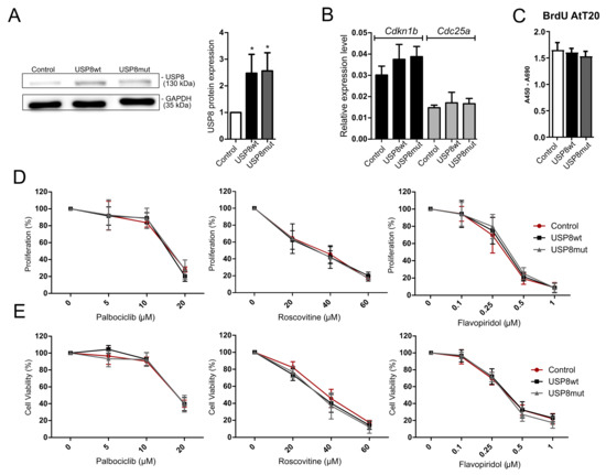 Treatment of AtT-20/D16v-F2 cells with overexpression of USP8-mutated and wild-type variant with cyclin-dependent kinase inhibitors (CDKIs); Control—empty vector, USP8wt—wild type USP8 overexpression; USP8mut—overexpression of mutated USP8. (A). Overexpression of mutated and wild-type Usp8 in AtT-20/D16v-F2 cells (Western blot membrane and densitometry results) * indicates p < 0.05; Original western blot figures can be found at Figure S1; (B). The expression levels of Cdkn1b and Cdc25a in AtT-20/D16v-F2 cells with overexpression of Usp8-mutated and wild-type variants. Cdk6 and Ccnd2 expression levels in AtT-20/D16v-F2 cells were not determined since they were below qRT-PCR detection.; (C). Proliferation of AtT-20/D16v-F2 cells with overexpression of Usp8-mutated and wild-type variants; (D). Proliferation rate of AtT-20/D16v-F2 cells with overexpression of USP8-mutated and wild-type variants treated with CDKIs: palbociclib, roscovitine and flavopiridol, measured with the BrdU assay; (E). The viability of AtT-20/D16v-F2 cells with overexpression of Usp8-mutated and wild-type variants treated with CDKIs: palbociclib, roscovitine and flavopiridol, measured with the MTT assay.