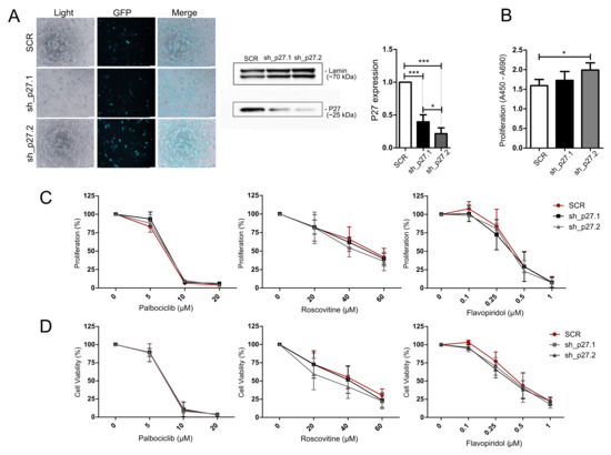 Treatment of AtT-20/D16v-F2 cells with p27 knockdown using cell cycle inhibitors. (A). Transfection efficiency and lowering of p27 expression with the shRNA hairpins sh_p27.1 (targeting 3′UTR) and sh_p27.2 (targeting coding sequence). Microscopic pictures were taken by the use of Olympus CKX53 with 10 × objective. p27 expression level as determined with Western blot and quantified with densitometry; * indicates p < 0.05, *** indicates p < 0.0001. (B). Change of proliferation rate in AtT-20/D16v-F2 cells with efficient p27 downregulation.; * indicates p < 0.05. (C). The effect of the cell cycle inhibitors palbociclib, roscovitine and flavopiridol on the proliferation rate of cells with downregulated p27 and control cells (scrambled shRNA, SCR) as measured with the BrdU assay. (D). The effect of cell cycle inhibitors on the viability of cells with downregulated p27 and control cells (SCR) as measured with the MTT assay.