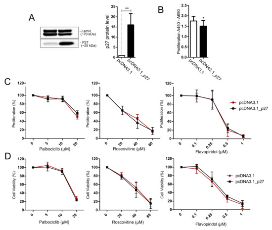 Treatment of AtT-20/D16v-F2 cells overexpressing p27 with cell cycle inhibitors. (A). Expression of p27 in AtT-20/D16v-F2 cells after transfection with expression plasmid vector with Cdkn1b coding sequence (pcDNA3.1_p27) and control cells (transfected with empty vector pcDNA3.1) as determined with Western blot and quantified with densitometry; ** indicates p < 0.001; (B). Proliferation rate in AtT-20/D16v-F2 cells with p27 overexpression and control cells; * indicates p < 0.05; (C). The effect of the cell cycle inhibitors palbociclib, roscovitine and flavopiridol on proliferation rate of cells overexpressing p27 and control cells as measured with the BrdU assay. (D). The effect of cell cycle inhibitors on viability of cells with p27 overexpression and control cells, measured with the MTT assay.