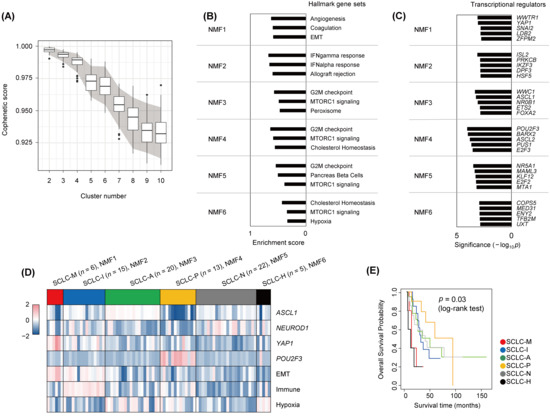 We obtained publicly available SCLC expression profiles of 81 SCLC tumors [5] to molecularly define SCLC subtypes. Expression data were subject to non-negative matrix factorization (NMF) for unsupervised discovery of SCLC subtypes [24]. To determine the number of potential molecular subtypes in the datasets, we performed subsampling-based permutation tests to obtain the distribution of stability measures (i.e., cophenetic scores) across different numbers of clusters (k = 2 to 10; Figure 1A) [42]. Stability scores showed a substantial drop at k = 4, consistent with the previous observation of four SCLC subtypes (SCLC-A, -N, -P, and -I) [14]. Notably, stability scores also decreased substantially after six clusters (k = 6), suggesting that additional SCLC subtypes were present in the datasets. Accordingly, we clustered SCLC transcriptomes into six subtypes (annotated as NMF1 to NMF6) and performed single sample GSEA analyses of metagenes or NMF bases as representative of subtype-specific gene expression patterns. The top three enriched molecular functions (Hallmark gene sets in MSigDB) are shown with their normalized enrichment scores in Figure 1B. NMF1 tumors were highly enriched for genes involved in angiogenesis, coagulation, and the EMT as molecular functions activated in NMF1 SCLC tumors. NMF2 tumors were enriched for immune-related functions of interferon-α- and -γ, consistent with immune-activated SCLC-I tumors. The remaining SCLC tumors (NMF3 to NMF5) showed up-regulation of genes with cell-cycle functions such as G2M checkpoint genes, suggesting high cellular turnover rates. In addition, NMF6 tumors showed relative up-regulation of hypoxia-related genes. The enrichment results for the full list of Hallmark gene sets are presented in Supplementary Figure S1.