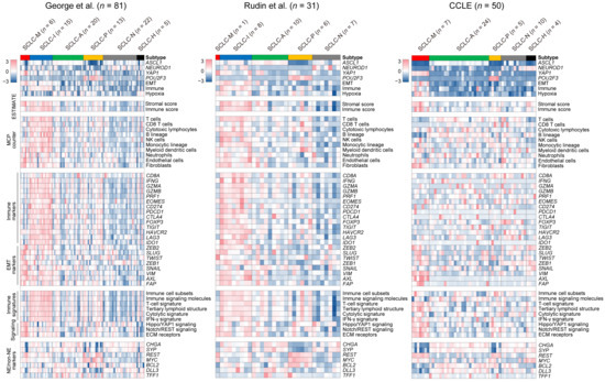 To characterize the molecular and microenvironmental features of the six SCLC subtypes across cohorts, we obtained two SCLC gene expression datasets including 31 primary SCLC [7] and 50 SCLC cell lines [43]. Using the expression profiles obtained for the six SCLC subtypes from the first dataset (‘George et al.’) as the training set, the six SCLC subtypes were annotated for two additional datasets (‘Rudin et al.’ and ‘CCLE’, respectively) using PAM [28]. The landscape of molecular and cellular features with respect to cluster membership across the three datasets is shown in Figure 2. The prevalence of each of the six SCLC subtypes in the two primary SCLC tumor datasets was 3.1–7.4% (SCLC-M, from ‘George’ and ‘Rudin’ datasets, respectively), 18.5–25.0% (SCLC-I), 24.7–31.3% (SCLC-A), 16.0–18.8% (SCLC-P), 21.9–27.2% (SCLC-N), and 0–6.2% (SCLC-H), suggesting that SCLC-M tumors are a minority subtype compared with SCLC-I tumors. Of note, examination of cell lines did not support the presence of SCLC-I tumors in contrast to the enrichment of SCLC-M cell lines (14.0% and 0% for SCLC-M and SCLC-I tumors in the ‘CCLE’ dataset, respectively). This suggests that SCLC-I tumors are largely determined by the presence of tumor-infiltrating lymphocytes in the tumor microenvironment and it is possible that SCLC-I tumors deprived of stromal or immune cells may resemble SCLC-M tumors.