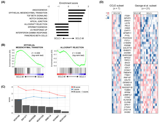 The gene expression heatmap of genes differentially expressed between SCLC-M and SCLC-I epithelial cells is shown in Supplementary Figure S6. Selected genes were further used to derive SCLC-M and SCLC-I tumor-intrinsic scores (designated as M- and I-scores, respectively) for seven SCLC-M cell lines (Figure 3C). M and I scores of the seven SCLC-M cell lines were inversely correlated (Pearson correlation coefficient of −0.58136, p value = 0.00001) and the cell lines were further sorted according to M- vs. I- differential scores. These findings further suggest that SCLC-M cell lines are not exclusive to SCLC-I tumors, some of which may harbor tumor-intrinsic features SCLC-I tumors. Figure 3D shows candidate genes whose expression was correlated with the M- vs. I- differential scores both in SCLC tumor (SCLC-M and SCLC-I) epithelial cells and SCLC-M cell lines. Pearson correlation coefficients with significance levels for selected genes are shown in Supplementary Figure S7. For example, ITGB1 (CD29) encoding integrin subunit beta 1 was transcriptionally up-regulated in SCLC-M primary epithelial cells and SCLC-I cell lines with high M scores. Integrin-mediated signaling is required for the TGFβ-promoted EMT progression [44] along with the direct impact of ITGB1 on known markers of EMT [45]. SH2B2 was up-regulated in SCLC-I primary epithelial cells and SCLC-I cell lines with high-level I scores. SH2B2 has previously been recognized as a negative regulator of cytokine signaling [46], thus its transcriptional up-regulation in epithelial cells and cell lines indicates that it may be a marker for SCLC regardless of the composition of the tumor microenvironment.