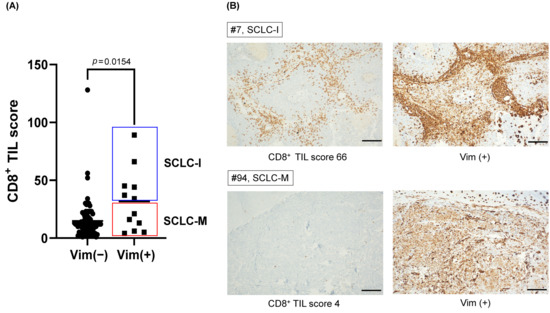 The prevalence of SCLC-M subtype in primary SCLC tumor cohort. (A) Mean CD8+ TIL scores of vimentin (+) tumors and vimentin (−) tumors. CD8+ TIL score of vimentin (+) tumors divided into SCLC-I and SCLC-M subtypes. (B) Representative immunohistochemical stains of CD8+ TIL high/Vimentin (+) (SCLC-I) and CD8+ TIL low/Vimentin (+) (SCLC-M) tumors. (scale bar; 100 μm).
