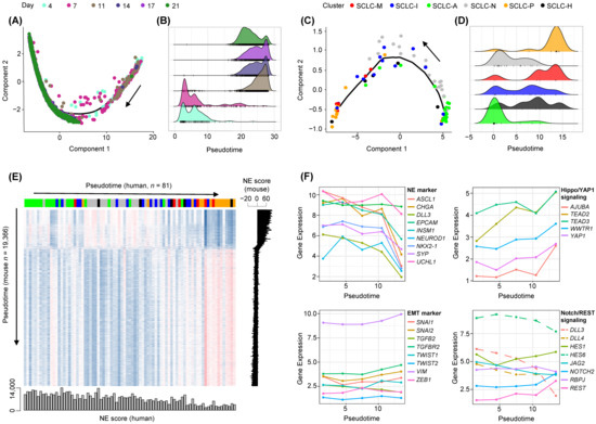 Single cell sequencing data of murine SCLC cell lines representing the MYC-driven early-to-invasive progression at distinct time points (4 to 21 days of culture) were obtained to enumerate the cellular NE-to-non-NE transition of SCLC tumors [40]. The linear trajectory of murine SCLC cells was inferred along with the pseudotime of cells as reported previously (Figure 5A). A clear distinction between early-passage cells (4 and 7 days) and late-passage cells (11 to 21 days) was observed along the inferred pseudotime (Figure 5B). Of note, we also observed a linear trajectory for human SCLC tumor epithelial cells encompassing the transition of NE-to-non-NE SCLC tumors (Figure 5C). The occurrence of SCLC subtypes in order of pseudotime highlights the fact that NE-tumors (SCLC-A and SCLC-N) and non-NE-tumors (SCLC-M and SCLC-P) are frequent during early and late development, respectively, whereas the remaining SCLC subtypes of SCLC-I and SCLC-H tumors appear to be intermediate tumor types (Figure 5D). The transcription-level concordance heatmap shows the cross-species correlation between the expression patterns of mouse cells (y-axis; 19,366 cells ordered by pseudotime) and those of human SCLC tumors (x-axis, 81 tumors ordered by pseudotime) (Figure 5E). NE scores of individual cells or tumors were calculated as described previously [40] and are shown according to pseudotime. For both species, the inferred pseudotime was in overall agreement with the changes in estimated NE scores indicating that trajectories largely reflect the NE-to-non-NE transition. The marked similarity between these mouse and human tumors in terms of inferred pseudotime suggests that human SCLC development representing the NE-to-non-NE transition recapitulates the mouse SCLC tumor early-to-invasive tumor progression. Expression levels of selected NE markers as well as those involved in the EMT, Hippo/YAP1, and Notch/REST signaling are shown for human SCLC tumors in order of pseudotime (Figure 5F). While NE markers showed decreasing patterns along pseudotime consistent with the NE-to-non-NE transition, EMT markers as well as those in Hippo/YAP1 and Notch/REST signaling pathways showed pseudotime-dependent up-regulation. This suggests that the NE-to-non-NE transition in murine SCLC tumors recapitulates the developmental trajectory of human SCLC tumors and allows discrimination of SCLC subtypes in terms of developmental order as represented by pseudotime.