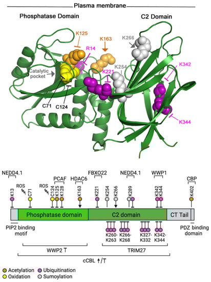 Lys163 acetylation and Lys266 sumoylation activate PTEN, but most PTEN modifications inhibit its phosphatase activity. PTEN’s structure (top) and the diagram of PTEN domains (bottom) are as in Figure 1. Post-translational modifications (PTMs) are indicated in different colors (codes along the bottom). PTMs activate (indicated with an arrow) or inhibit (arrows ended with a line) PTEN activity. The effect of some PTMs on PTEN is unknown (arrows without end). The enzymes regulating PTEN PTMs are indicated in the diagram. Most PTMs shown are inhibitory, as only Lys163 acetylation and Lys266 sumoylation increase PTEN action. The N-terminal PIP2-binding motif, as well as the C-terminal (CT)-tail and PDZ binding domains, are shown only in the diagram (in grey), as they are not resolved in the structure, i.e., neither K13 nor K402 PTMs are shown in the structure; R14 is indicated on the structure to offer an idea of where K13 localizes. The region including K289 is also unresolved and not shown on the structure. The residues modified by WWP2 or cCBL are presently unknown, these E3 ligases and the multiple residues modified by TRIM27 are shown in the bottom part of the diagram.