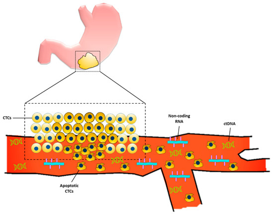 Liquid biopsy markers for gastric cancer. Primary gastric tumor sheds circulating tumor cells (CTCs) into the bloodstream. Some of the CTCs undergo apoptosis which allows for the release of the cell’s genetic material, including circulating tumor DNA (ctDNA) and non-coding RNAs.