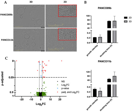 Basic characteristics of 3D and 2D cultured PANCO09b and PANCO11b cells grown in adv.DMEM/F-12. (A): Morphology of PANCO09b and PANCO11b grown in 3D or 2D. 4× magnification (3D) and 10× magnification (2D). (B): Doubling time in hours and growth rate/day of PANCO11b grown in 3D or 2D. Data are presented as mean ± SD. (C): Volcano plot representation of differential gene expression analysis between 3D organoids and corresponding 2D cultured cells. Red dots show significantly differentially expressed genes in 3D compared to 2D.