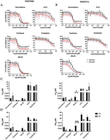 Chemosensitivity of PANCO09b and PANCO11b cells grown in adv.DMEM/F-12 in 3D vs. 2D. (A): Dose–response curves of PANCO09b grown in 3D vs. 2D. (B): Dose–response curves of PANCO11b grown in 3D vs. 2D. Thick, dark lines represent the mean and thin, light lines show the independent experiments in triplicates. (C): Bar graph of IC50 values of PANCO09b and PANCO11b grown in 3D vs. 2D. (D): Bar graph of GR50 values of PANCO09b and PANCO 11b grown in 3D vs. 2D. Data are presented as mean ± SD of three independent experiments performed in triplicate. Independent sample t-test was performed to assess differences. * = p < 0.05, *** = p < 0.001.