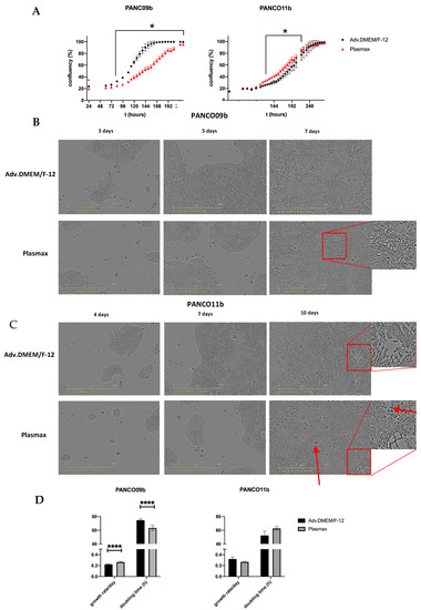 Growth curves of PANCO11b grown in adv.DMEM/F-12 and Plasmax differed significantly from 126–218 h after plating, although the difference was small as compared to PANCO09b (Figure 3A). On day four, 2-dimensonally growing PANCO11b cells formed colonies in both culture media instead of being distributed as single cells (Figure 3C). After seven days, these clusters merged in both conditions. Heterogeneity of the cell cultures was evident, with cells of different shapes and sizes growing along each other. In some areas, cells were rather thin and elongated, while in other, less dense areas, cells were oval and bigger. After ten days, cells reached 100% confluency in both adv.DMEM/F-12 and Plasmax. In both conditions, we observed cells growing on top of each other, which was slightly more prominent in Plasmax (red boxes). Generally, after ten days in physiological medium, the culture looked more disorganized, and there seemed to be more dead cells (red arrows).