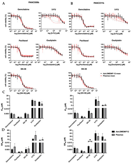 Sensitivity of 2D cultured PANCO09b and PANCO11b cells to gemcitabine, paclitaxel, SN-38, 5-FU, and oxaliplatin in adv.DMEM/F-12 versus Plasmax. (A): Dose–response curves of PANCO09b cells grown in adv.DMEM/F-12 or Plasmax. (B): Dose–response curves of PANCO11b cells grown in adv.DMEM/F-12 or Plasmax. Thick, dark lines represent the mean and light, thin lines show independent experiments in triplicates. (C): Bar graph of IC50 values of PANCO09b and PANCO11b cells grown in adv.DMEM/F-12 or Plasmax. (D): Bar graph of GR50 values of PANCO09b and PANCO11b cells grown in adv.DMEM/F-12 or Plasmax. Data are presented as mean ± SD of three independent experiments performed in triplicate. Independent sample t-test was performed to assess differences. * = p < 0.05.