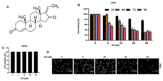 Anti-proliferative effects of GS on MM cells. (A) Chemical structure of Z-isomer of guggulsterone (4,17(20)-pregnadiene-3,16-dione). GS inhibits the viability of (B) U266 in a concentration-dependent manner but does not inhibit the viability of (C) PBMCs (normal control cells) after treatment with 5, 10, 25, and 50 µM of GS for 48 h. The graphs display the mean ± SD of three independent experiments with replicates. * p < 0.05, ** p < 0.001. (D) Cell viability assessment performed using live/dead cytotoxicity kit at 5, 10, 25, and 50 µM GS treatment on U266 cells where green indicates live cells and red indicates non-viable cells (Scale bar, 200 μm).