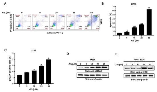 Apoptotic effects of GS on MM cells. (A) U266 cells were incubated with 5, 10, 25, and 50 µM of GS for 48 h. Representative graphs were obtained by flow cytometric analysis after double-staining with Annexin-V-FITC/PI. (B) The graph displays the values of mean ± SD of the percentage of the apoptotic cells of three independent experiments. * p < 0.05, *** p < 0.01. (C) U266 cells were incubated with 5, 10, 25, and 50 µM of GS for 48 h and analyzed for DNA double-stranded breaks using flow cytometry. The graph displays the mean ± SD of three independent experiments * p < 0.05. (D) U266 and (E) RPMI 8226 cells were treated with increasing concentrations of GS for 48 h, lysed, and immunoblotted against p-H2AX and β-actin. Full Western blot images can be found at Supplementary Materials File S1.