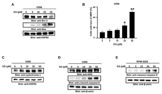 GS-mediated intrinsic and extrinsic apoptotic pathways in MM cells. U266 cells were treated with increasing concentrations of GS for 48 h, and cell lysates were immunoblotted with antibodies for (A) Bcl-2, Bax, and HSP60. (B) U266 cells were incubated with 5, 10, 25, and 50 µM of GS for 48 h, and cells were stained with JC1 stain and analyzed using flow cytometry. The graph displays the mean ± SD of three different experiments * p < 0.05 ** p < 0.01. U266 and RPMI 8226 cells were treated with increasing concentrations of GS for 48 h, and protein expression levels of (C) cytochrome c, HSP60. (D) DR-5, cleaved caspase-8, and β-actin in U266 cells and (E) cleaved caspase-8, and β-actin in RPMI 8226 cells were determined. Full Western blot images can be found at Supplementary Materials File S1.