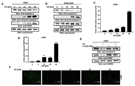 GS-mediated PARP cleavage and caspase activation in MM cells. U266 (A) and RPMI 8226 (B) cells were treated with 5, 10, 25, and 50 µM of GS for 48 h. 50 µg of proteins were resolved on SDS-PAGE and probed against caspase-3, cleaved caspase-3, PARP, and β-actin. Flow cytometric analysis of GS-mediated activation of caspase-3 (C) and cleavage of PARP (D) in U266 cells. The graph displays the mean ± SD of three different experiments (* p < 0.05, ** p < 0.01). U266 cells were treated with 30 µM z-VAD-FMK for 2 h, followed by 50 µM of GS for 48 h. Cells were lysed, and protein expressions of (E) caspase-3, PARP, and HSP60 were determined. (F) Representative fluorescence images reporting active caspase-3/caspase-7 (green nuclei) in apoptotic U266 cells (Scale bar, 200 μm). Full Western blot images can be found at Supplementary Materials File S1.