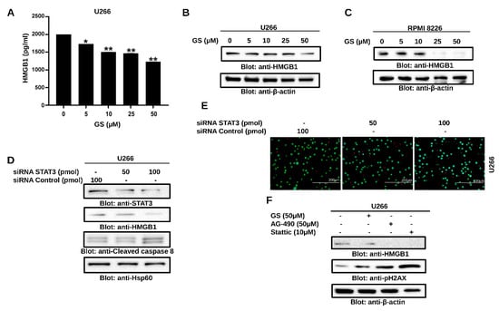 GS downregulates HMGB1 expression via the JAK/STAT signaling pathway. U266 cells were incubated with GS for 48 h and cell supernatant was collected and measured for (A) levels of HMGB1 using ELISA. The graph displays the mean ± SD of three independent experiments. * p < 0.05, ** p < 0.01. 50 µg of proteins from (B) U266 and (C) RPMI 8226 cells were resolved on SDS-PAGE, and probed against HMGB1 and β-actin. (D) U266 cells were transfected with either control (100 pM) or STAT3 specific siRNA (50 or 100 pM) and protein expression of STAT3, HMGB1, cleaved-caspase-8 and HSP60 was determined. (E) Cell viability was also determined using a live/dead cytotoxicity kit (Scale bar, 200 μm). (F) U266 cells were treated with 50 µM GS, 50 µM of AG-490 and 10 µM Stattic for 48 h. A total of 50 µg of proteins were separated on SDS-PAGE and protein expression of HMGB1, p-H2AX and β-actin were determined. Full Western blot images can be found at Supplementary Materials File S1.