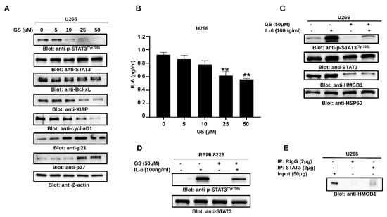 IL-6 plays a vital role in sustaining the growth and proliferation of MM [36] via the activation of STAT3 [37]. Therefore, we measured the secretion of IL-6 in the culture media of U266 cells treated with GS, and the secretion of IL-6 was significantly reduced. Untreated cells exhibited a basal release of 0.95 pg/mL ± 0.03 of IL-6, while the concentration of 25 µM and 50 µM of GS decreased the IL-6 concentration to 0.61 ± 0.06 and 0.56 ± 0.01 pg/mL, respectively (Figure 6B). IL-6-treated U266 and RPMI 8226 cells showed an increased level of STAT3 phosphorylation, while those pre-treated with GS exhibited decreased STAT3 phosphorylation, suggesting that GS inhibits IL-6-induced STAT3 activation (Figure 6C,D). Interestingly, GS treatment of U266 cells also led to the downregulation of HMGB1, suggesting the involvement of HMGB1 in IL-6-mediated STAT3 signaling in MM cells (Figure 6C). As shown in Figure 6E, a specific band of HMGB1 was detected only in STAT3 immunoprecipitated U266 lysate and not in normal rabbit IgG, suggesting an association of HMGB1 with STAT3 in MM cells.