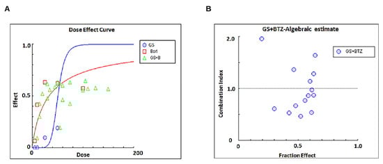 Calculating the synergistic concentrations required for a combination treatment with GS and BTZ. U266 cells were treated with 5, 10, 25, and 50 μM of GS or 5,10, 25, and 50 nM of BTZ alone or in different combinations to calculate the synergistic apoptotic response of GS and BTZ at 48 h. The concentration and fraction effect (A,B) graphs were created using CalcuSyn software. CI were calculated by employing Chou and Talalay’s methodology [41].