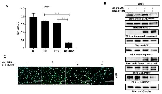 GS sensitizes MM cells to BTZ. U266 cells were incubated with 10 μM of GS and 10 nM of BTZ alone or in combination for 48 h. (A) The bar graph displays the cell viability determined by CCK-8 analysis. Data is presented as mean ± SD (n = 6. *** p < 0.0001). (B) The GS and BTZ- treated cells were lysed, and protein expressions of p-STAT3, STAT3, cleaved caspase-8, Bid, caspase-3, cleaved caspase-3, PARP, HMGB1, and β-actin were determined. (C) Cell viability using a live/dead cytotoxicity kit was also assessed (Scale bar, 200 μm). Full Western blot images can be found at Supplementary Materials File S1.