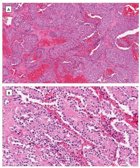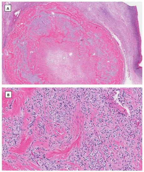 In 2009, Irving J.A. and Young R.H. described a novel and rare ovarian stromal neoplasm and named it the microcystic stromal tumor [36]. MCST presents as a unilateral solid tumor in middle-aged women without hormonal manifestations. Microscopically, most MCSTs show a distinctive triad of histologic features, including microcystic change, solid cellular regions, and extensive hyalinized fibrous stroma. Tumor cells have round to oval nuclei with inconspicuous nucleoli and the eosinophilic cytoplasm (Figure 2). Besides the unique extensive hyalinized fibrous stroma, the cytological features of these tumor cells are similar to those seen in ovarian SPPN. Immunohistochemical staining shows that tumor cells are positive for CD10, cyclin D1 and vimentin and variably positive for WT1 and CD56. Tumor cells are usually negative for cytokeratin, epithelial membrane antigen, synaptophysin, chromogranin, INSM1, inhibin, calretinin, and SF1. Maeda et al. first identified an aberrant β-catenin nuclear and cytoplasmic accumulation in MCST cells immunohistochemically [37]. Further molecular studies showed the identification of CTNNB1 mutations in exon 3, identical to that of SPPN, indicating dysregulation of the Wnt/β-catenin pathway in the pathogenesis of this neoplasm. Several other studies subsequently confirmed the above findings [38,39,40,41]. Furthermore, recent studies indicate that the incidence of MCST has increased among patients affected by familial adenomatous polyposis (FAP) due to APC germline mutations [42,43]. In both MCST cases reported by Liu et al. [43] and Lee et al. [42] there is no CTNNB1 mutation identified besides APC mutations. This has prompted a comprehensive molecular study by McCluggage’s group with the largest case series of MCST thus far [44]. Among 10 cases of MSCTs, they identified 8 cases harboring CTNNB1 mutations and 2 cases having APC mutations including one with germline APC mutation. CTNNB1 and APC mutations are mutually exclusive with no neoplasm exhibiting a mutation in both [44].