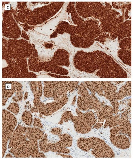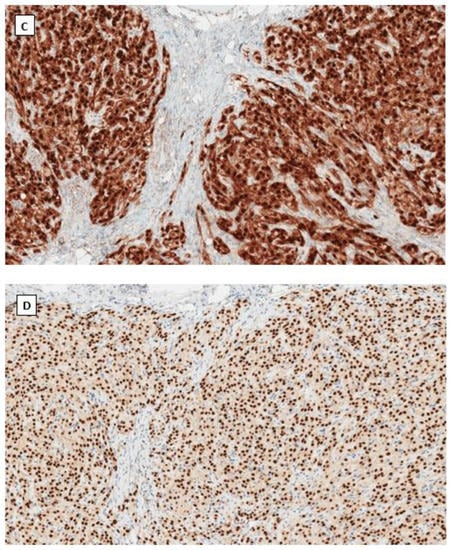 As mentioned above, the aberrant nuclear and cytoplasmic immunostaining pattern of β-catenin is the most striking immunohistochemical phenotype found in ovarian SPPN, MCST, and SRSCT. Immunohistochemical detection of nuclear and cytoplasmic accumulation of β-catenin has much higher sensitivity compared to molecular testing because mutations in several Wnt signaling genes, including CTNNB1 and APC, can result in the same aberrant expression pattern of β-catenin protein [24,44,51].