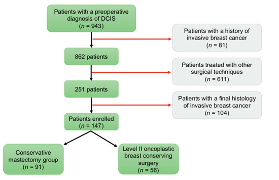 - De Lorenzi, F.; Di Bella, J.; Maisonneuve, P.; Rotmensz, N.; Corso, G.; Orecchia, R.; Colleoni, M.; Mazzarol, G.; Rietjens, M.; Loschi, P.; et al. Oncoplastic breast surgery for the management of ductal carcinoma in situ (DCIS): Is it oncologically safe? A retrospective cohort analysis. Eur. J. Surg. Oncol. 2018, 44, 957–962. [Google Scholar] [CrossRef]