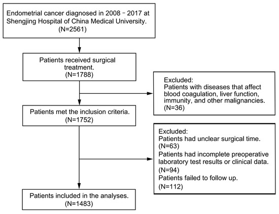 From January 2008 to June 2017, a total of 2561 patients were diagnosed with endometrial cancer at Shengjing Hospital of China Medical University, 1788 of which received surgical treatment. Patients were excluded from this study if they had hematological, liver, or immune system complications or if they had infectious diseases or other malignancies. Clinical data and preoperative laboratory test results were collected; patients were followed up with every three months for the first two years after surgery and every six months after two years had passed. Disease progression was carefully assessed by medical history collection, physical examination, pelvic ultrasound, abdominal–pelvic computed tomography, serum CA125 level monitoring, and pathological biopsy. Patients with unclear operative time, incomplete preoperative laboratory findings, missing clinical data, or failure to follow up with were excluded from the study. The study complied with the Declaration of Helsinki and was approved by the Ethics Committee of Shengjing Hospital of China Medical University (No. 2017PS292K). All patients gave informed consent during the information collection process. A flowchart of the patient inclusion and exclusion process is shown in Figure 1.