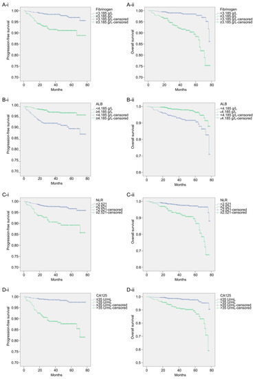 The survival curves for each biomarker level group. (A-i): Kaplan–Meier curves of PFS for each fibrinogen level group; (A-ii): Kaplan–Meier curves of OS for each fibrinogen level group; (B-i): Kaplan–Meier curves of PFS for each ALB level group; (B-ii): Kaplan–Meier curves of OS for each ALB level group; (C-i): Kaplan–Meier curves of PFS for each NLR level group; (C-ii): Kaplan–Meier curves of OS for each NLR level group; (D-i): Kaplan–Meier curves of PFS for each CA125 level group; (D-ii): Kaplan–Meier curves of OS for each CA125 level group.