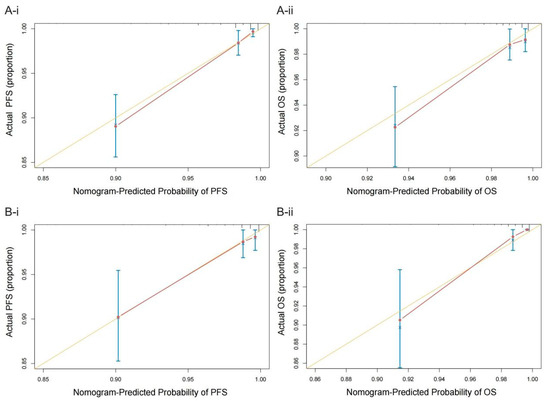 Calibration plots of the nomograms of PFS (A-i) and OS (A-ii) in the training cohort and the nomograms of PFS (B-i) and OS (B-ii) in the validation cohort. The yellow line represents the performance of the ideal nomogram; the red line represents the performance of the proposed nomogram; the red circles represent the sub-cohorts of the dataset; × is the bootstrap-corrected estimate of the nomogram; and the error bars represent the 95% CI.