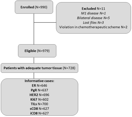 Selected patient and tumor characteristics are presented in Table 1. The median age at diagnosis was 54 years (range 28–83). About half of the women were postmenopausal (57.6%), had undergone modified radical mastectomy (55.7%), and carried tumors of 2.1–5 cm (51.7%). A central assessment of ER/PgR and HER2 status was available for 88.3% (n = 643) and 95.6% (n = 696) of patients with evaluable FFPEs, respectively. The discordance rate between the local and central assessment was 11.4% for ER/PgR and 8.9% for HER2. Luminal A tumors were classified in 24.5%, luminal B in 44.1%, luminal HER2 in 12.9%, HER2-enriched in 7.1%, and triple-negative (TNBC) in 11.4% of informative cases (n = 588), based on the central assessment. Additionally, CD8 data were available for 86.1% of patients with evaluable FFPEs (n = 627 patients). No significant differences were noted in basic patient and tumor characteristics between the total cohort of eligible patients (n = 979) and patients with evaluable FFPEs for translational research (n = 728).