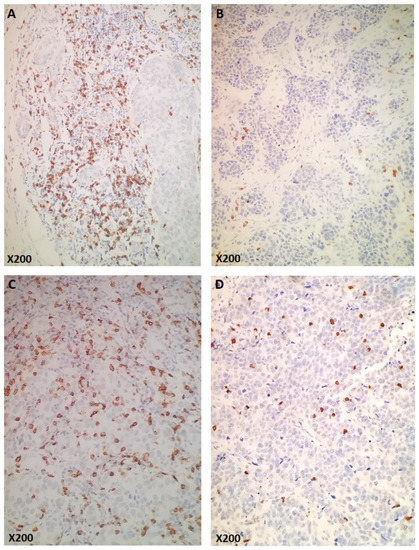 Examples of CD8 immunohistochemical expression (original magnification as indicated). (A,B): Cases representing high (A) and low (B) numbers of stromal CD8 (sCD8+). (C,D): Cases representing high (C) and low (D) numbers of intratumoral (intraepithelial) CD8 (iCD8+).