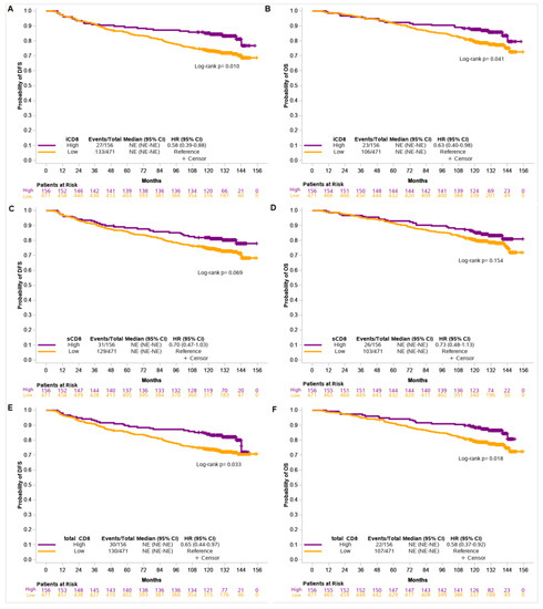 Disease-free survival (DFS) and overall survival (OS) based on iCD8 (A,B), sCD8 (C,D), and total CD8 (E,F) counts/mm2 in the entire cohort of patients.