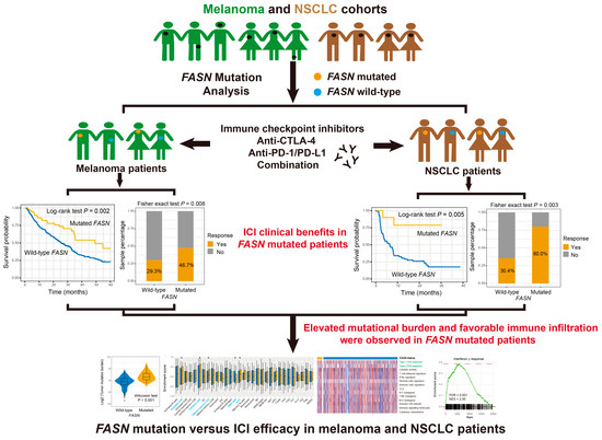 Flowchart of this study. Association of FASN mutations with ICI efficacy in melanoma and NSCLC.