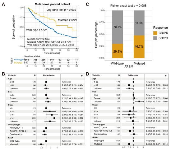 FASN mutated melanoma patients exhibited a preferable immunotherapeutic survival than the rest of the patients (p = 0.002; Figure 2A). This connection was still significant in a multivariable adjusted Cox regression (p = 0.001; Figure 2B). Survival predictive capacities for FASN alterations in single ICI cohorts (Figure S3) and specific therapies (Figure S4) were separately shown. Patients with FASN mutations also exhibited an immunotherapeutic response advantage over the rest of the patients (response rate: 46.7% vs. 29.3%, p = 0.008; Figure 2C). A multivariable adjusted analysis further confirmed this connection (p = 0.014; Figure 2D).